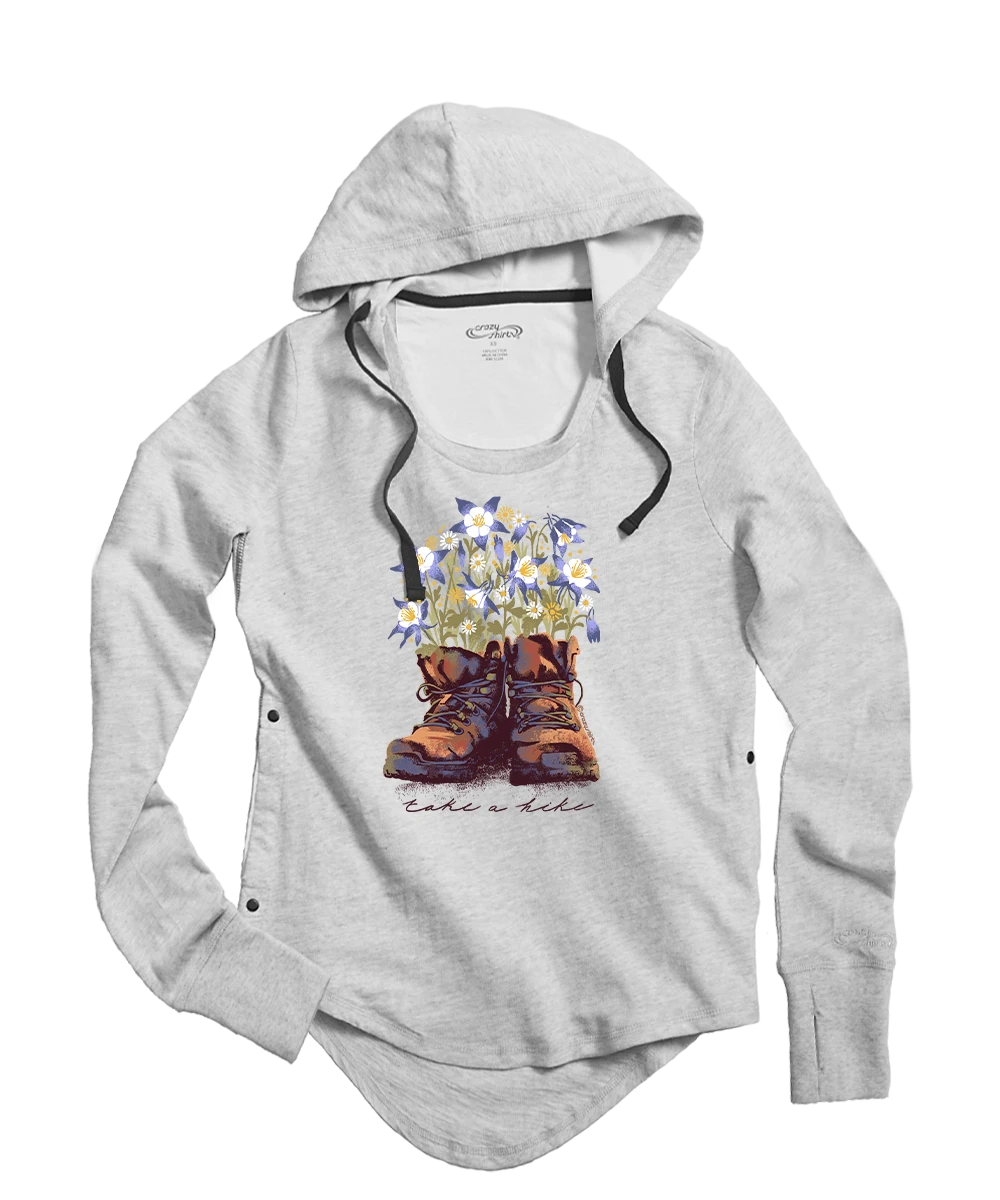 Columbine Boots – White Gray Heather Long Sleeve Harmony Hooded T