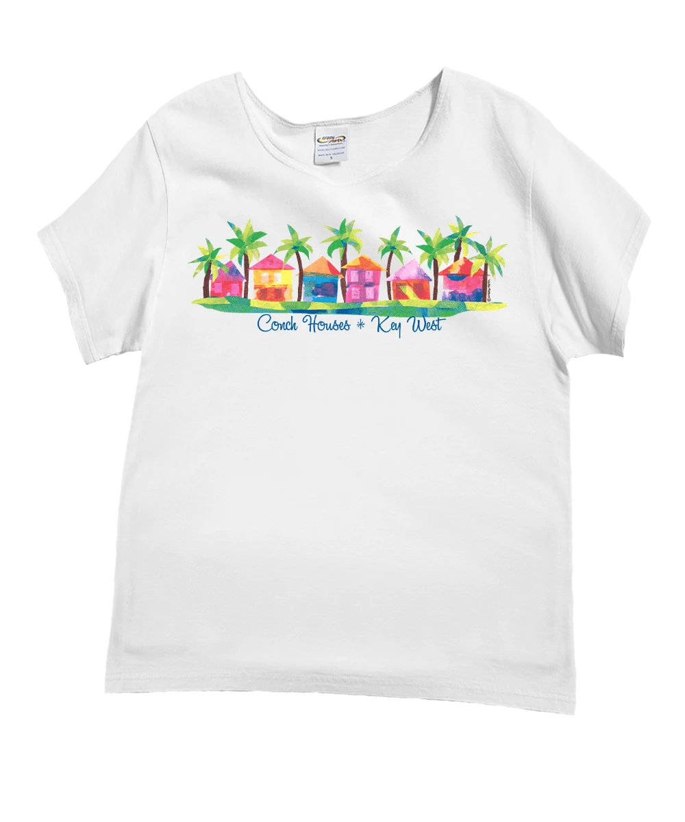 Pops of pink, splashes of sunshine, and palms swaying in the breeze – this cheerful lineup of Conch houses captures the charm and color of island life in Key West, one cottage at a time. Made from 100% cotton that is ring-spun then combed to make it luxuriously soft, this tee also features a scoop neck and relaxed cut to be both cute and comfortable. We only use environmentally friendly water-based inks that penetrate the material’s fiber resulting in more vibrant colors, softer feel and artwork that doesn’t crack or peel. Plus, it is proudly printed in the United States for quality you can see and designs that stand the test of time.