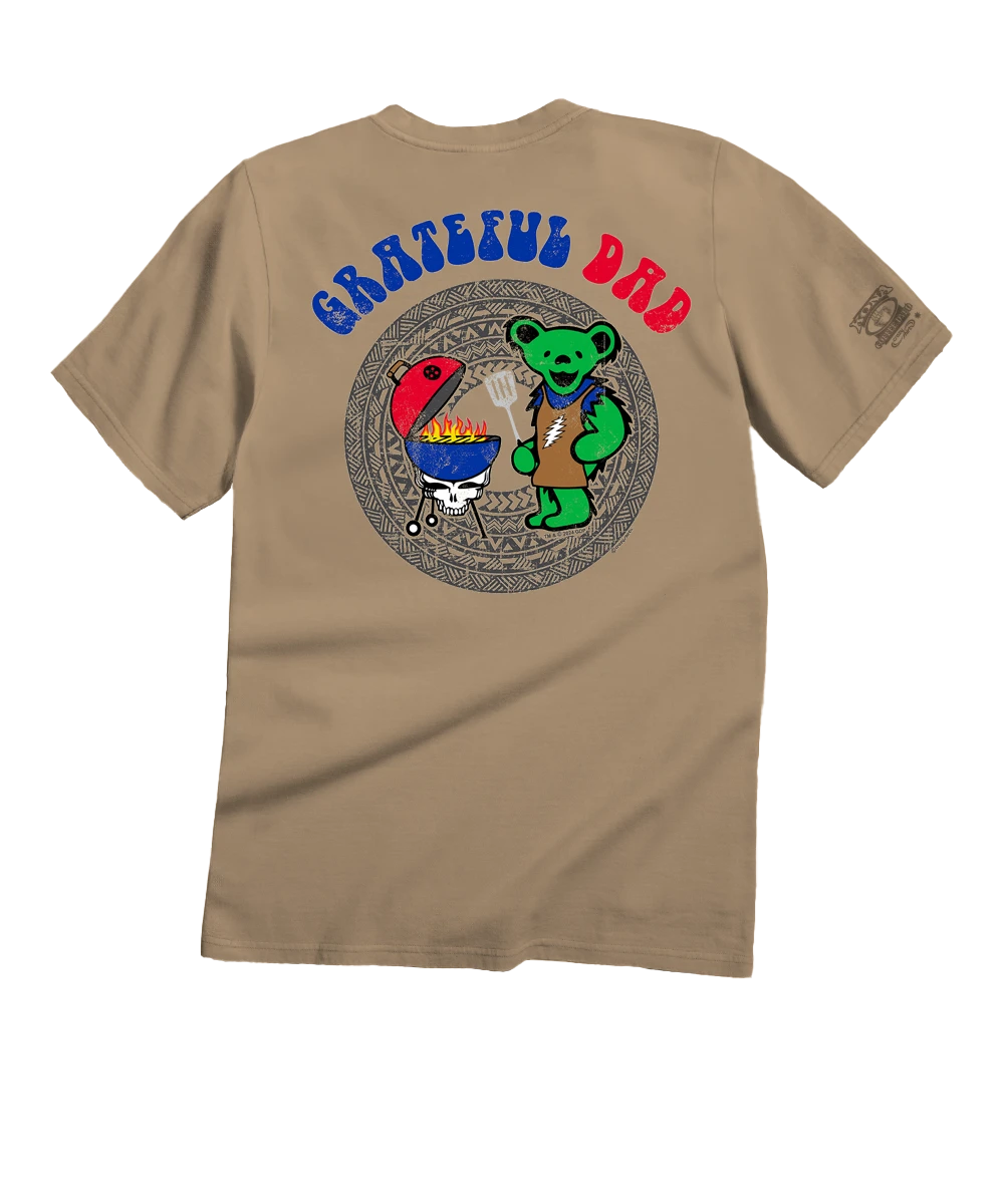 Dad and the Dead. They go together like the old man and the backyard grill. Throw ’em all together in this officially licensed Grateful Dead t-shirt and you’ve the perfect combo for a whole slew of fatherly fun. Made using our exclusive Kona coffee specialty dyeing process and featuring 100% combed ring-spun cotton, this t-shirt has 50+ SPF protection to keep you feeling cool, calm and protected all year long. We only use environmentally friendly, water-based inks that penetrate the material’s fiber resulting in more vibrant colors, softer feel and artwork that doesn’t crack or peel. Plus, it is proudly printed in the United States for quality you can see and designs that stand the test of time.