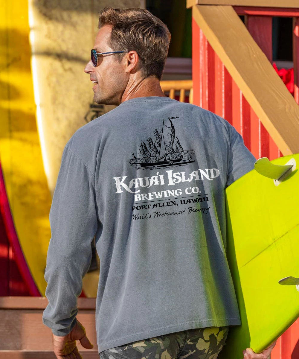 Crafted where the ocean meets the edge of the world, this nod to Kaua‘i Island Brewing Co. brings big flavor with a small-town soul. Featuring a classic island schooner and a tip of the cap to Port Allen’s proud claim to fame – this one’s brewed for the bold. Made using our exclusive specialty volcanic ash dying process and featuring 100% combed ring-spun cotton, this t-shirt has 50+ SPF protection to keep you feeling cool, calm and protected all year long. We only use environmentally friendly, water-based inks that penetrate the material’s fiber resulting in more vibrant colors, softer feel and artwork that doesn’t crack or peel. Plus, it is proudly printed in the United States for quality you can see and designs that stand the test of time.