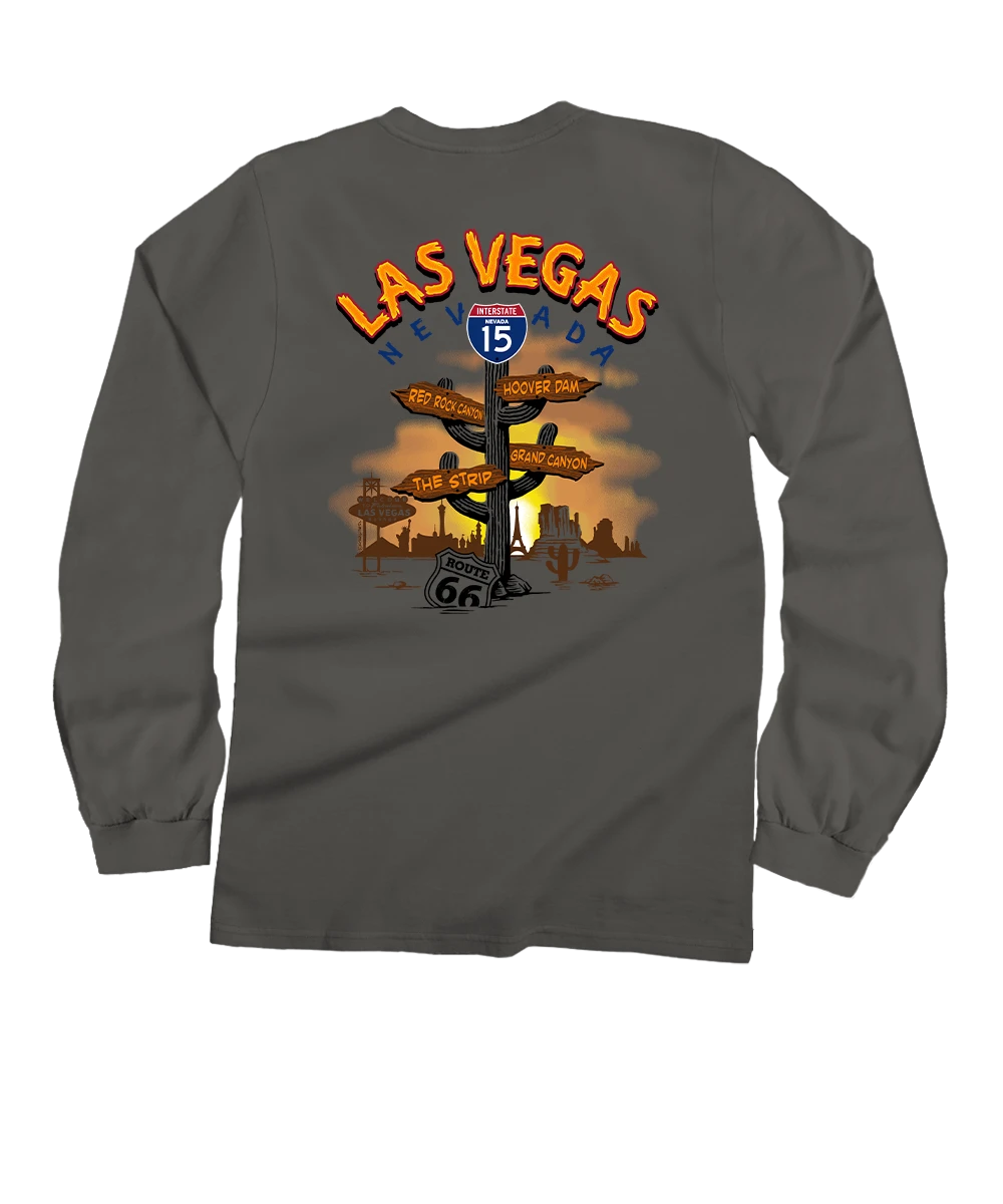 Desert skies, neon lights, and open roads collide in a scene straight from the heart of the Southwest. Whether you’re chasing sunsets at Red Rock or memories on the Strip, this artwork points the way to all things iconic. A tribute to road trips, pit stops, and that unmistakable Vegas energy. Made using our exclusive specialty volcanic ash dying process and featuring 100% combed ring-spun cotton, this t-shirt has 50+ SPF protection to keep you feeling cool, calm and protected all year long. We only use environmentally friendly, water-based inks that penetrate the material’s fiber resulting in more vibrant colors, softer feel and artwork that doesn’t crack or peel. Plus, it is proudly printed in the United States for quality you can see and designs that stand the test of time.