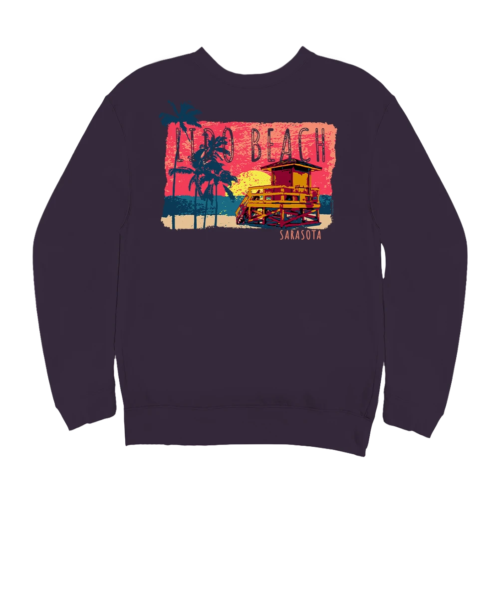 Sunsets that sizzle, palms that sway, and lifeguard towers glowing in golden hour light – this vibrant design brings the bold, beachy energy of Sarasota’s Lido Beach to life in full technicolor. Heavyweight fleece gives this sweatshirt a warm and comfy feel that can’t be beat. It features a relaxed fit that’s roomy while the spandex reinforced collar and cuffs as well as the taped neck and shoulder seams make sure it keeps its shape. Our blackberry specialty dye gives this top its unique color and provides built-in 50+ UPF protection. Like our legendary t-shirts, the vibrant designs are screen printed on so they won’t crack or peel.