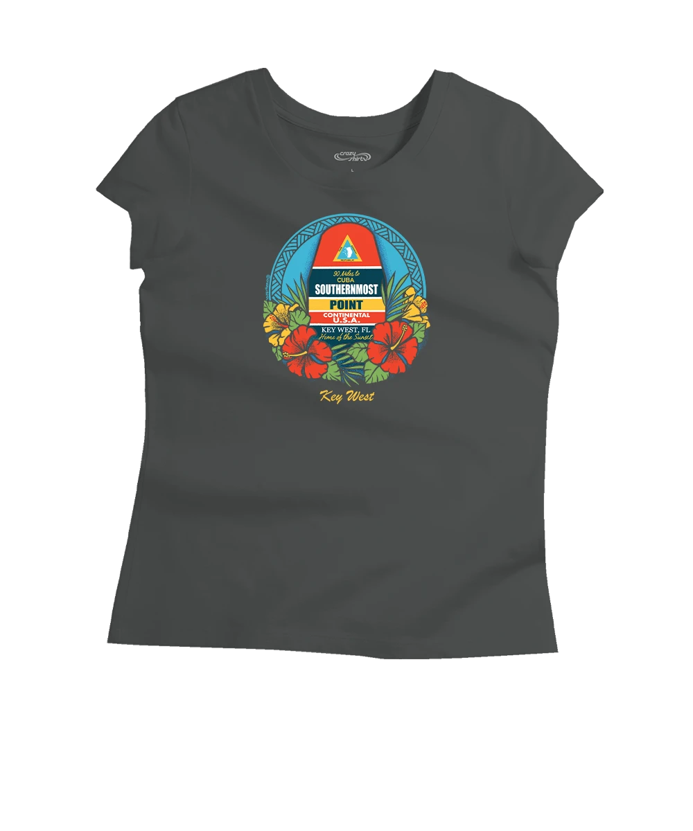 Tropical blooms and bold island vibes frame the most iconic buoy in the Keys. With a nod to sun-drenched days and 90 miles to Cuba, this design celebrates Key West’s colorful claim to fame. Our luxurious Pima cotton t-shirts are finished with a special wash for ultimate softness and durability and also feature a narrow ribbed neck for feminine appeal. We only use environmentally friendly water-based inks that penetrate the material’s fiber resulting in more vibrant colors, softer feel and artwork that doesn’t crack or peel. Plus, it is proudly printed in the United States for quality you can see and designs that stand the test of time.
