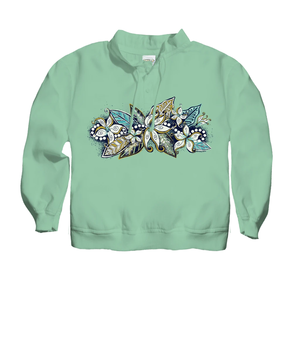 On the island of Kauai, the mokihana plant’s berries are strung into leis that are representative of the local culture. This linear design is lush and lively as the rainforests where these plants grow, allowing you to embrace the spirit and beauty of the Garden Isle. Dyed using our key lime specialty dyeing process and crafted from 100% cotton that is ring-spun and sueded for softness and durability, this lightweight pullover also features a relaxed cut and spandex at the cuff and bottom hem to make it the perfect layering top. We only use environmentally friendly, water-based inks that penetrate the material’s fiber resulting in more vibrant colors, a softer feel and artwork that doesn’t crack or peel. Plus, it is proudly printed in the United States for quality you can see and designs that stand the test of time.