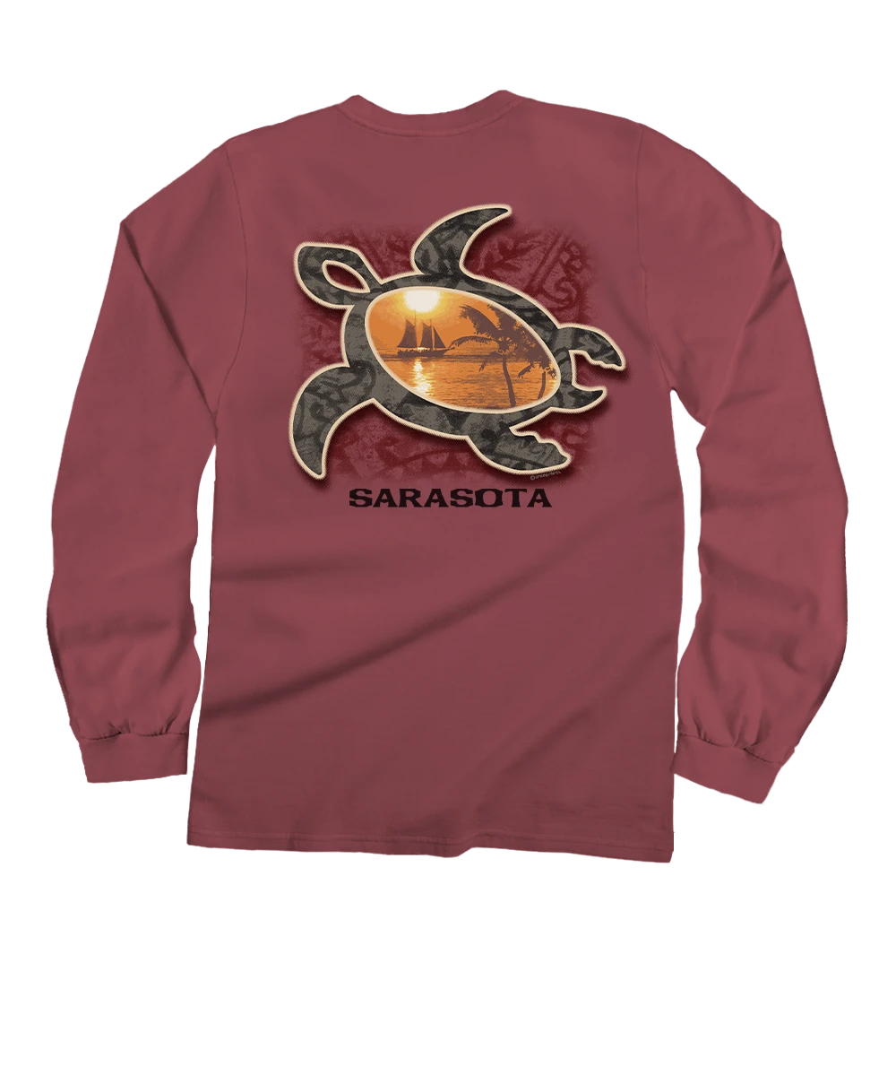 As the sun dips low and sailboats drift by, this peaceful moment is captured inside the gentle shape of a sea turtle. It’s pure Sarasota magic – where the water glows, the breeze calms, and the shoreline feels like home. Made using our exclusive Paradise Red specialty dyeing process and featuring 100% combed ring-spun cotton, this t-shirt has 50+ SPF protection to keep you feeling cool, calm and protected all year long. We only use environmentally friendly water-based inks that penetrate the material’s fiber resulting in more vibrant colors, softer feel and artwork that doesn’t crack or peel. Plus, it is proudly printed in the United States for quality you can see and designs that stand the test of time.