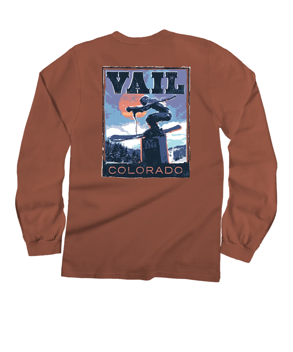 Carved from the heart of 1966 and launched into legend, this bold design celebrates Vail’s roots and the timeless rush of catching air above Colorado’s iconic peaks. A throwback to deep turns, crisp air, and the golden age of alpine adventure. Made using our exclusive specialty dyeing process that uses real Chile peppers and featuring 100% combed ring-spun cotton, this t-shirt has 50+ SPF protection to keep you feeling cool, calm and protected all year long. We only use environmentally friendly water-based inks that penetrate the material’s fiber resulting in more vibrant colors, softer feel and artwork that doesn’t crack or peel. Plus, it is proudly printed in the United States for quality you can see and designs that stand the test of time.