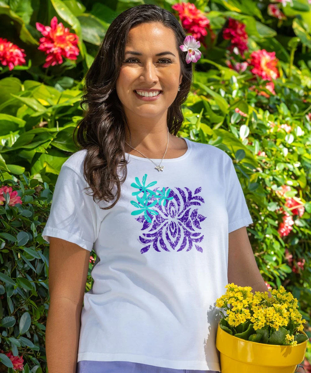 The Tiare flower signifies harmony in Polynesian culture, and this symmetric design makes it easy to see why. With its delicate artwork and positive colors, it is sure to help you find the tranquility that only the islands can provide. Made from 100% cotton that is ring-spun then combed to make it luxuriously soft, this tee also features a scoop neck and relaxed cut to be both cute and comfortable. We only use environmentally friendly, water-based inks that penetrate the material’s fiber resulting in more vibrant colors, softer feel and artwork that doesn’t crack or peel. Plus, it is proudly printed in the United States for quality you can see and designs that stand the test of time.