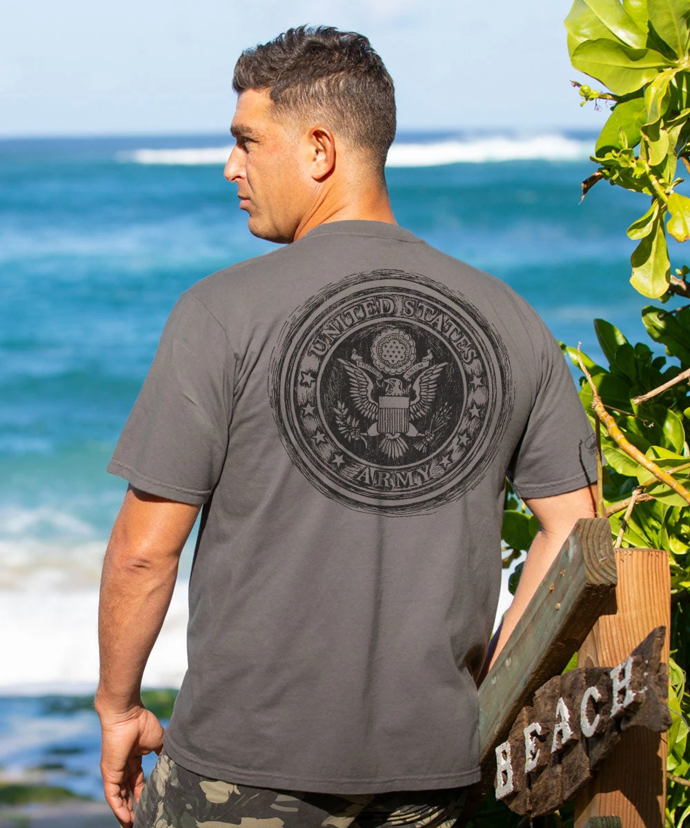 It’s fitting that the US Army’s official symbol uses The Great Seal of the United States in its makeup because the Army’s lineage goes all the way back to the Revolutionary War. The black on gray design gives an added sense strength to this important representation of America’s military and history. Made using our exclusive specialty dyeing process that uses real volcanic ash and featuring 100% combed ring-spun cotton, this t-shirt has 50+ SPF protection to keep you feeling cool, calm and protected all year long. We only use environmentally friendly, water-based inks that penetrate the material’s fiber resulting in more vibrant colors, softer feel and artwork that doesn’t crack or peel. Plus, it is proudly printed in the United States for quality you can see and designs that stand the test of time.