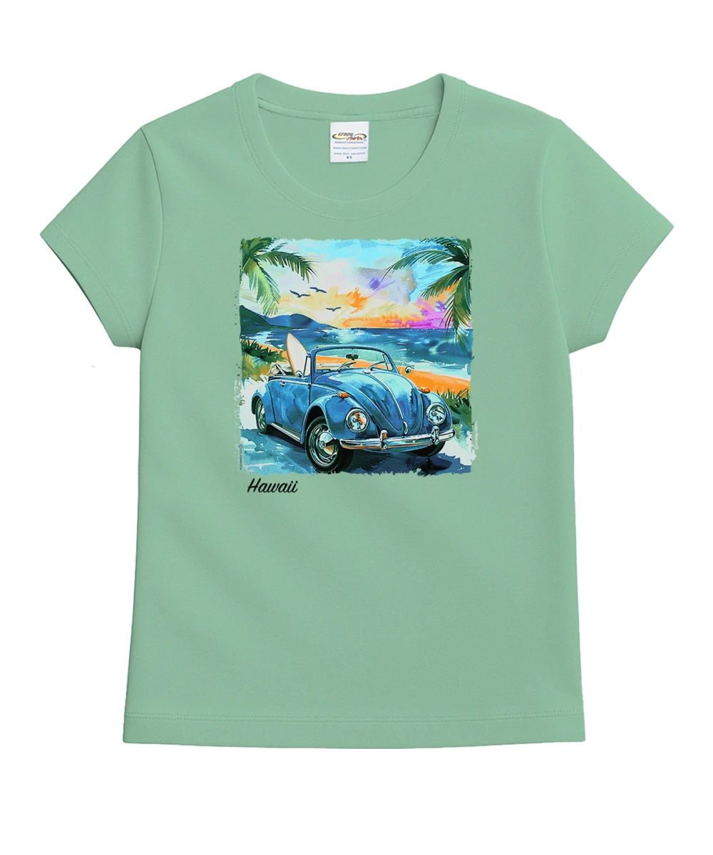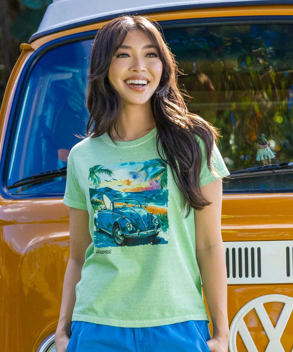 What painting of paradise is complete without a VW bug with surfboard in the back? Not this one. If you love to put the top down and explore Hawaii, then pull on this top and hit the road! Made using our exclusive key lime specialty dyeing process and featuring 100% combed ring-spun cotton, this t-shirt has 50+ SPF protection to keep you feeling cool, calm, and protected all year long. We only use environmentally friendly, water-based inks that penetrate the material’s fiber resulting in more vibrant colors, a softer feel, and artwork that doesn’t crack or peel. Plus, it is proudly printed in the United States for quality you can see and designs that stand the test of time.
