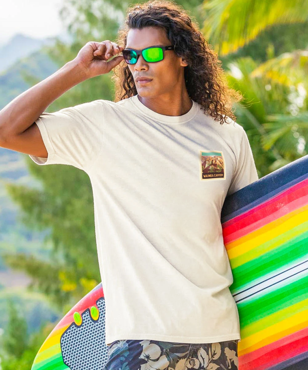 Called the “Grand Canyon of the Pacific”, the Waimea Canyon is 3,500 feet deep and a natural wonder on par with anything in Hawaii or the world over. We’re so happy it is protected in a National Park so its beauty-captured here by one of our local artists-lasts for generation after generation to see and enjoy. Made using our exclusive specialty dying process that uses real coconut and featuring 100% combed ring-spun cotton, this t-shirt has 50+ SPF protection to keep you feeling cool, calm and protected all year long. We only use environmentally friendly, water-based inks that penetrate the material’s fiber resulting in more vibrant colors, a softer feel and artwork that doesn’t crack or peel. Plus, it is proudly printed in the United States for quality you can see and designs that stand the test of time.